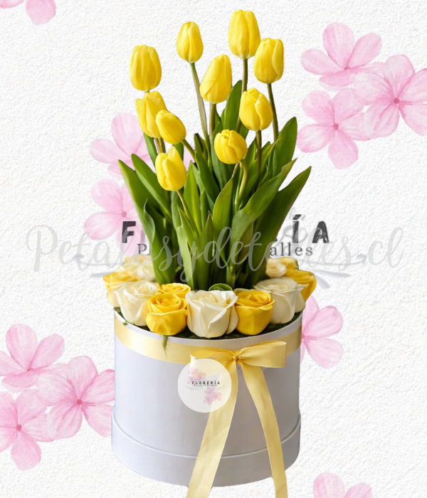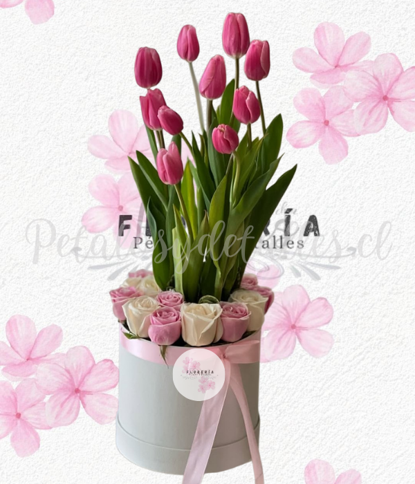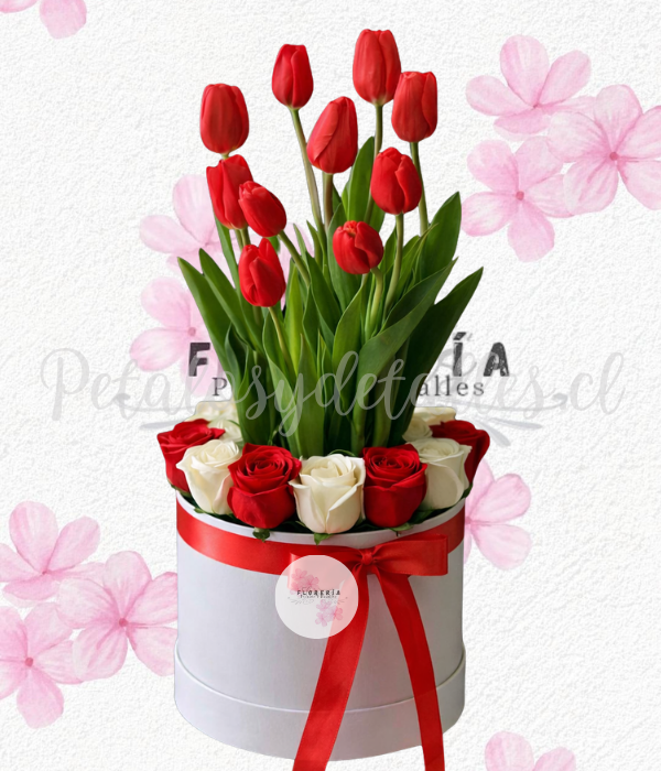 Box con 10 rosas importadas y 10 tulipanes seleccionados