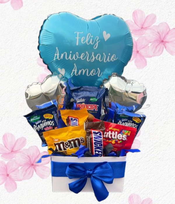 Box cuadrado regalón, en 10 golosinas a disponibilidad, 3 Globos…
