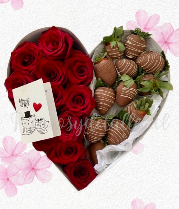 Caja corazon en 12 rosas importadas, 12 frutillas decoradas