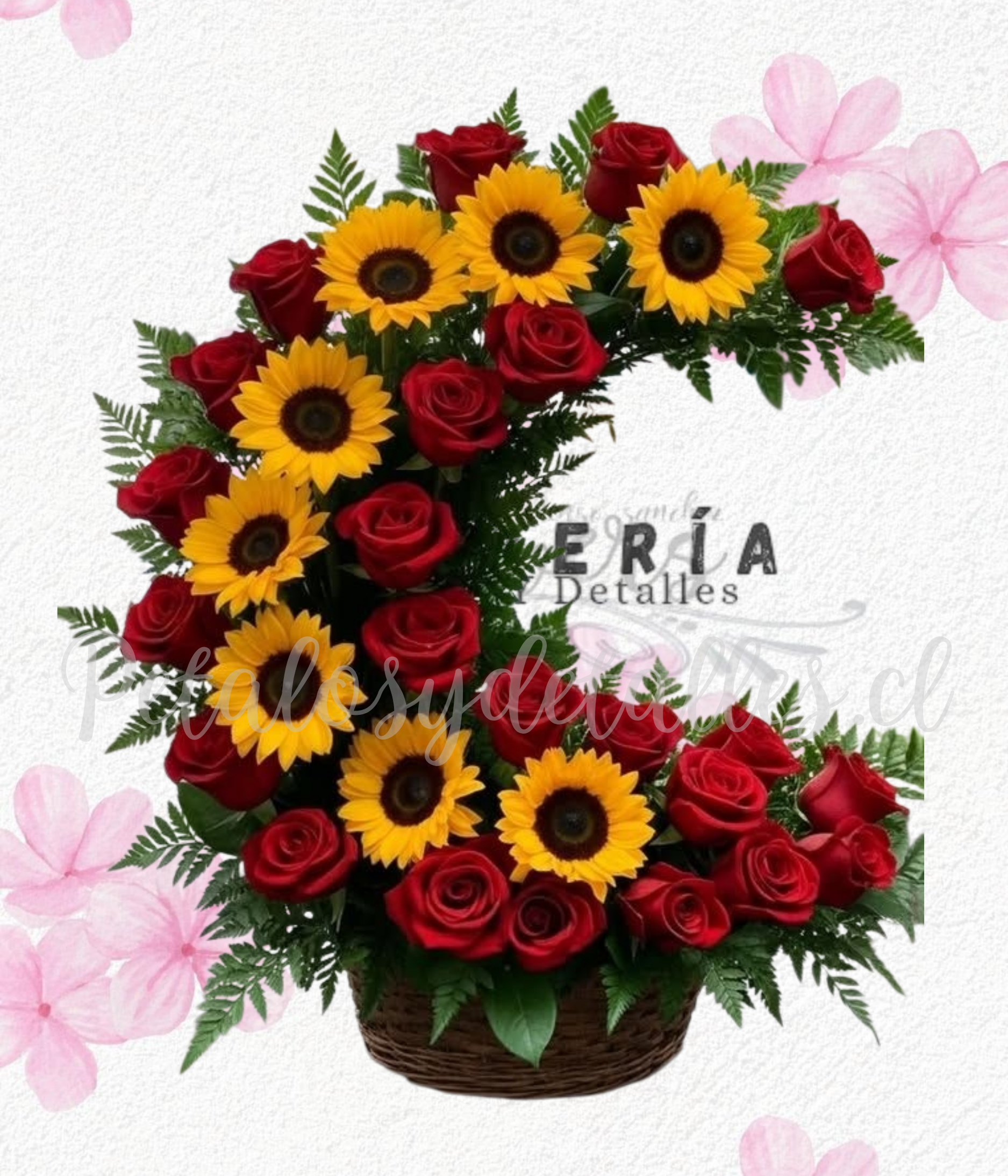 / Elegante arreglo LUNA en 24 rosas y 6 radiantes girasoles