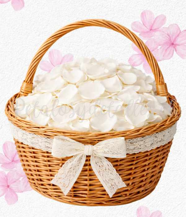 Pétalos de rosas naturales blancos, en canasta y lazo