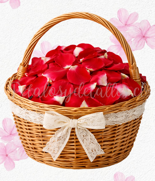 Pétalos de rosas naturales rojas, en canasta y lazo