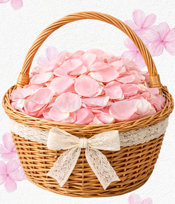 Pétalos de rosas naturales rosados, en canasta y lazo