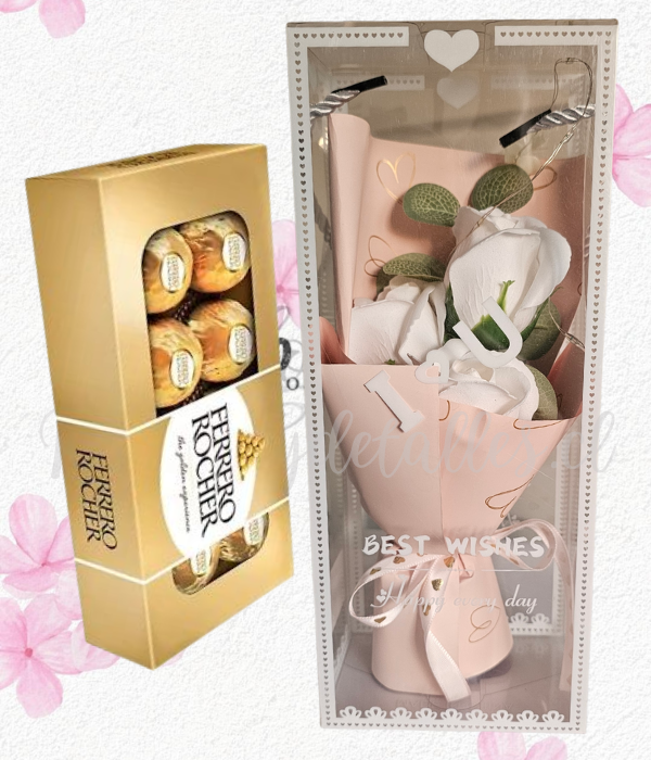 Ramito 3 rositas de jabón blancas en caja de acetato y bombones