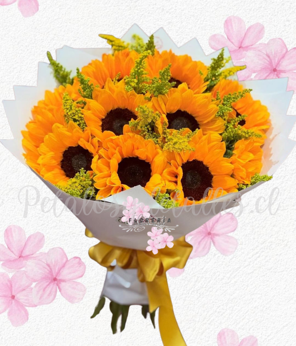 Ramo de 12 girasoles, follaje verde y linda envoltura