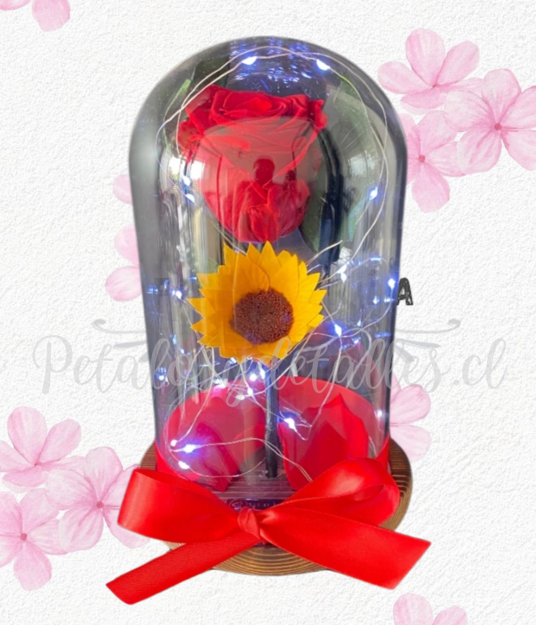 Rosa preservada eterna en cúpula de vidrio, acompañada de girasol preservado.