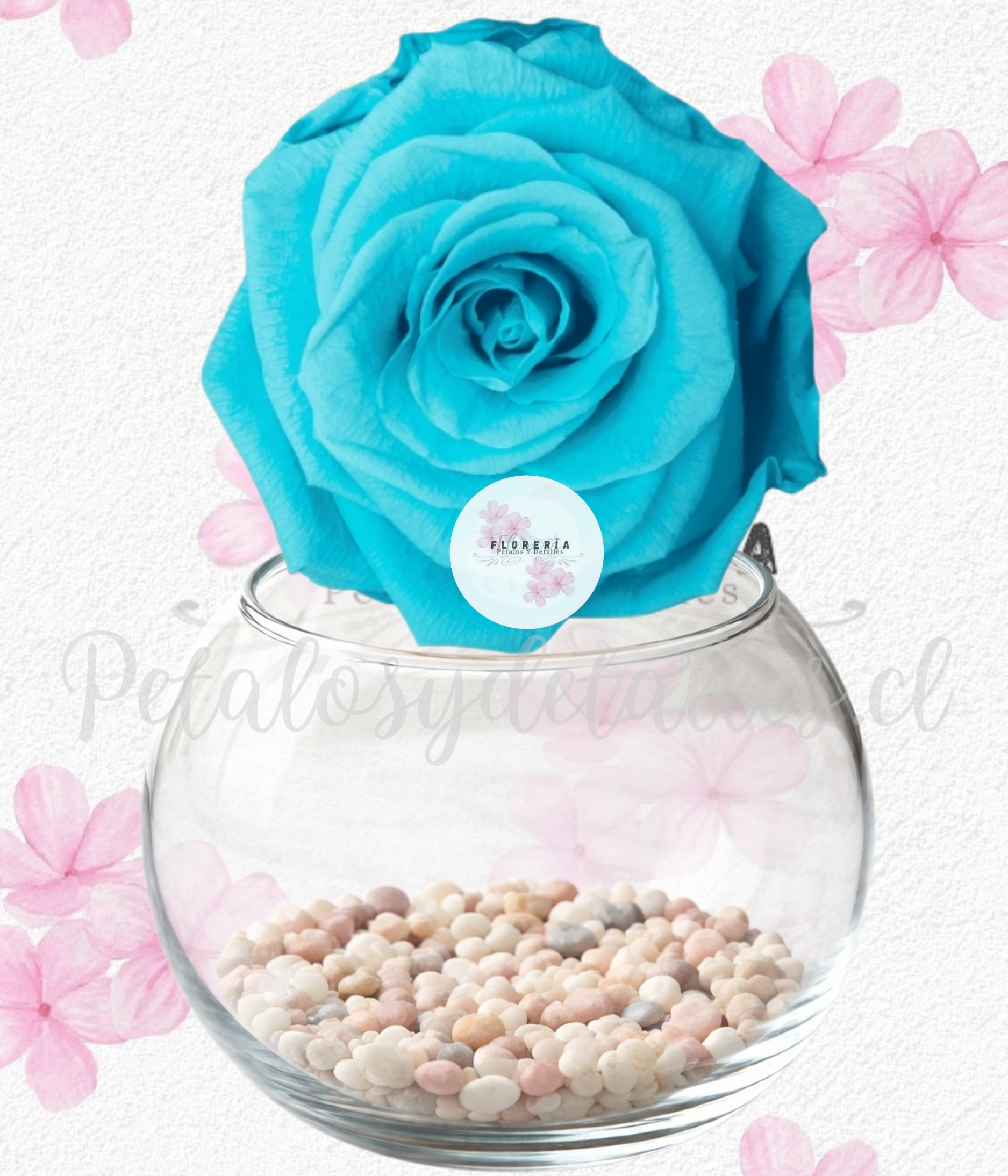La rosa preservada en pecera combina la delicadeza de una flor natural eternamente conservada con la armonรญa de piedras decorativas. Su diseรฑo en base de vidrio permite apreciar cada detalle, creando una pieza elegante y atemporal que no necesita agua ni mantenimiento. Un regalo perfecto para expresar sentimientos que perduran en el tiempo, o para decorar espacios con un toque romรกntico y sofisticado.