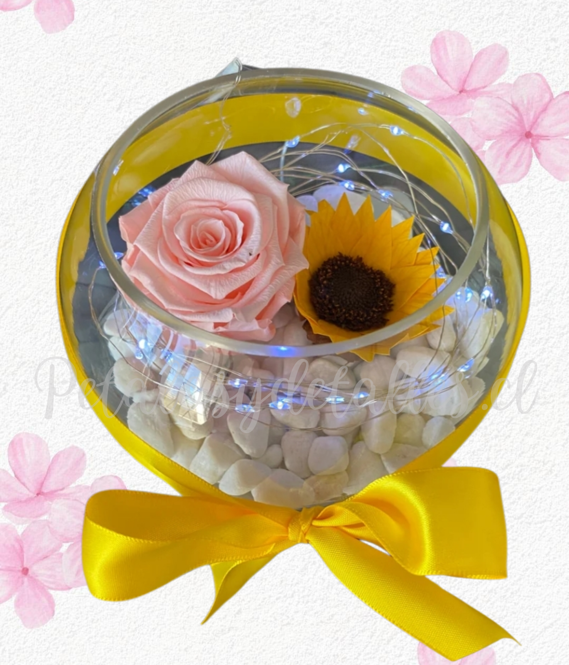 La rosa preservada en pecera combina la delicadeza de una flor natural eternamente conservada con la armonรญa de piedras decorativas. Su diseรฑo en base de vidrio permite apreciar cada detalle, creando una pieza elegante y atemporal que no necesita agua ni mantenimiento. Un regalo perfecto para expresar sentimientos que perduran en el tiempo, o para decorar espacios con un toque romรกntico y sofisticado.